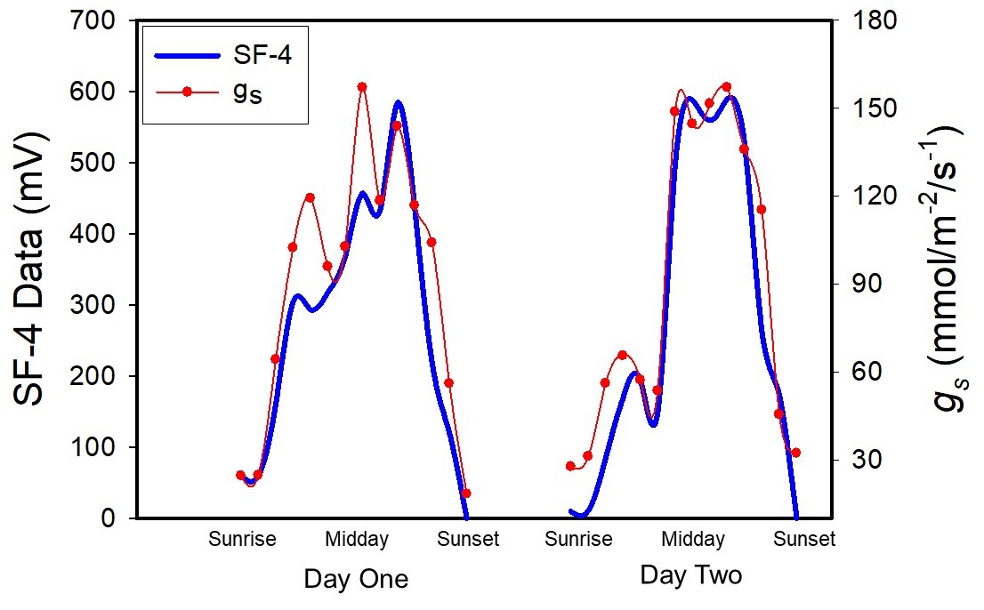 图 2 展示了两天内的气孔导度和 SF-4M 数据。红线表示使用 SC-1 叶片气孔计测量的气孔导度,实线表示 SF-4M 传感器记录的数据。图 2 表明,传统方法测量的气孔导度与 SF-4M 连续传感器测量的气孔导度之间存在密切相关性。