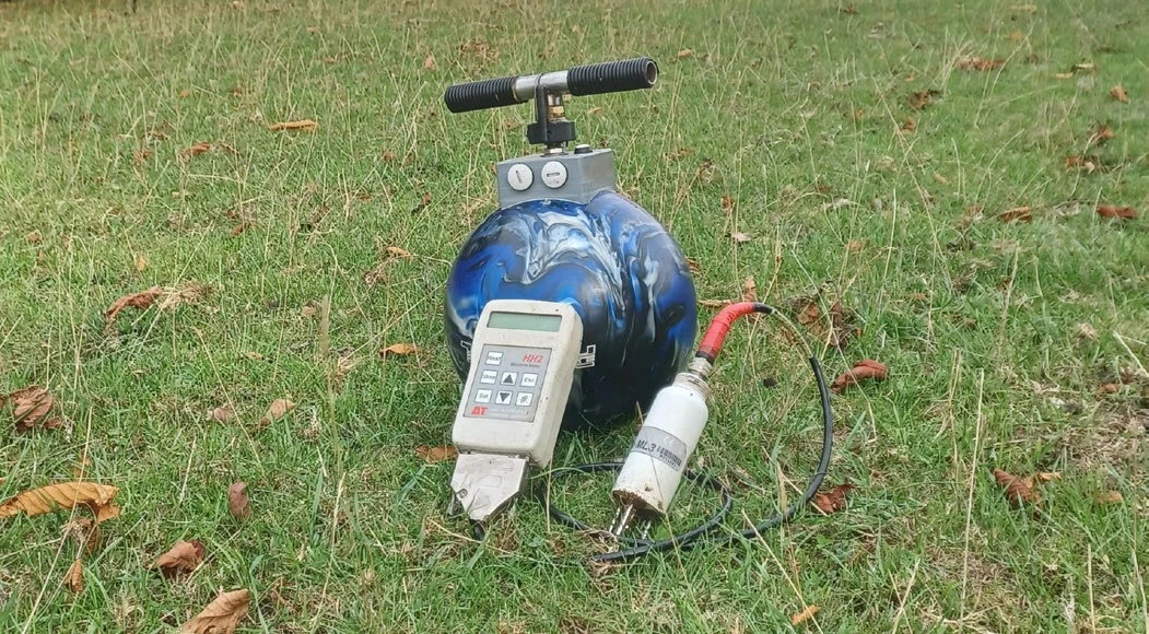 冲击力测量装置由一颗约 7 公斤的保龄球改造而成,通过从不同高度释放该装置,可以模拟马蹄高速冲击地面的力量,从而评估地表在不同深度的能量吸收能力。