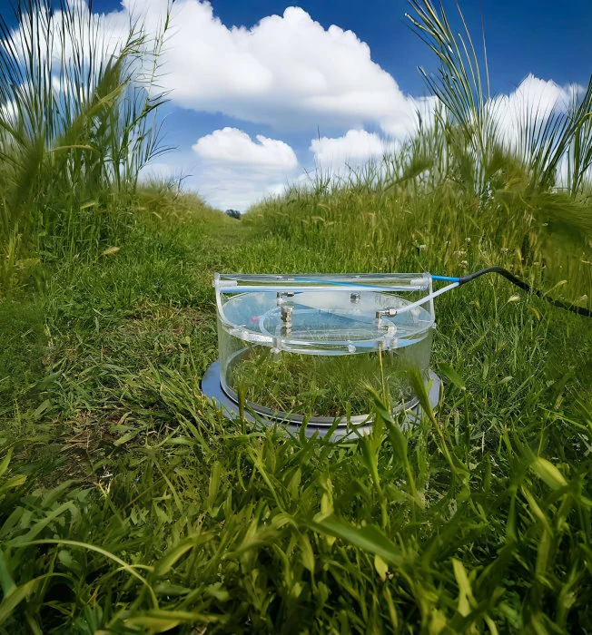T 型土壤呼吸室采用创新的内部气体混合系统,无需依赖任何活动部件,并配备了一个传感器,用于测量室内的温度、相对湿度和气压。呼吸室与地面之间的接口设计为绝对密封,使用带有环形密封圈的 AISI 316 不锈钢套筒。套筒的设计旨在尽量减少从地面突出的部分,从而限制阴影投射到测量区域,即使在太阳始终接近地平线的极地地区也是如此。