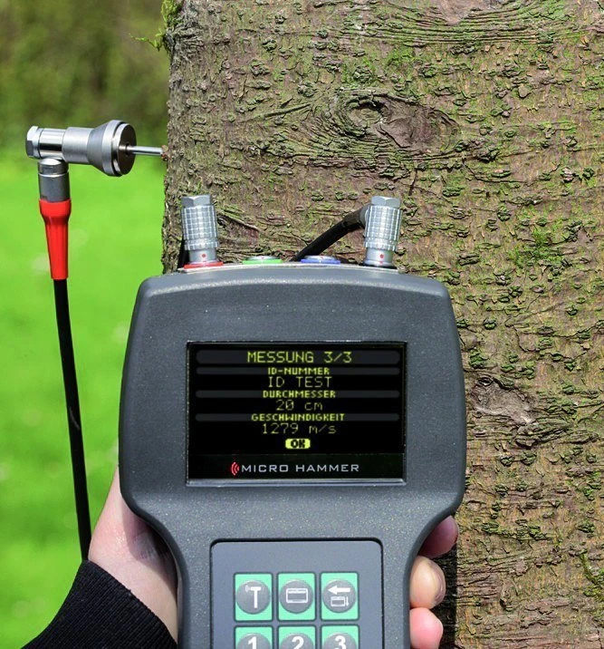 IML 微锤式木材应力波声速仪是一款专为树木与木质结构健康评估设计的便携式检测设备。该仪器通过敲击激发应力波,并精确测量应力波在木材中的传播时间,从而计算出传播速度。借助声速变化情况,可以快速判断木材内部是否存在密度异常、腐朽、空洞、裂纹等隐患,实现对树木内部结构的早期探测与科学诊断。